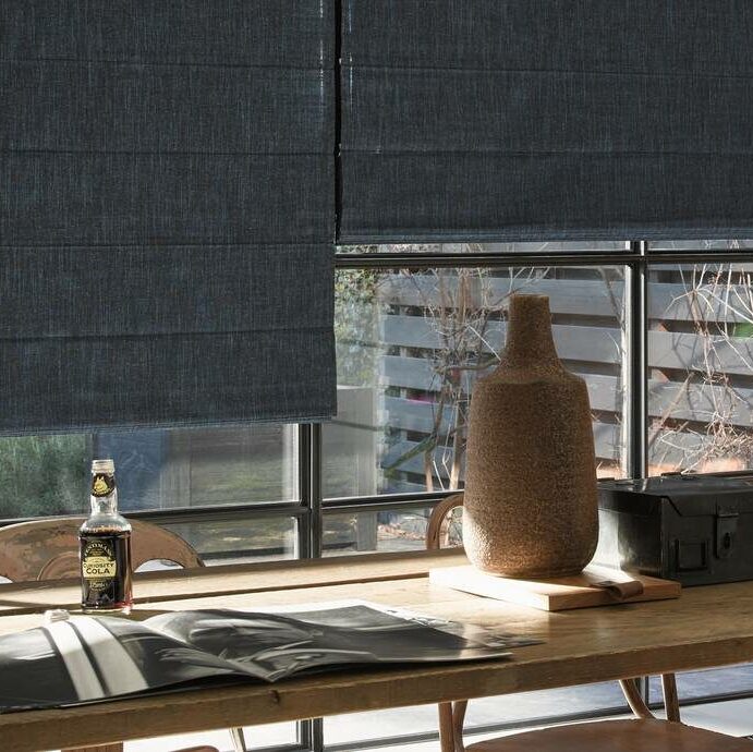 Le store bateau offre un gain d’encombrement et une modulation fine de la lumière ; les rideaux apportent un geste décoratif et une isolation renforcée avec les doublures épaisses. Nous pouvons coordonner les deux.
